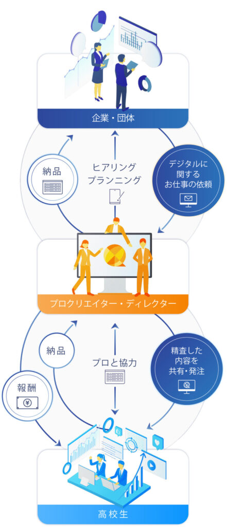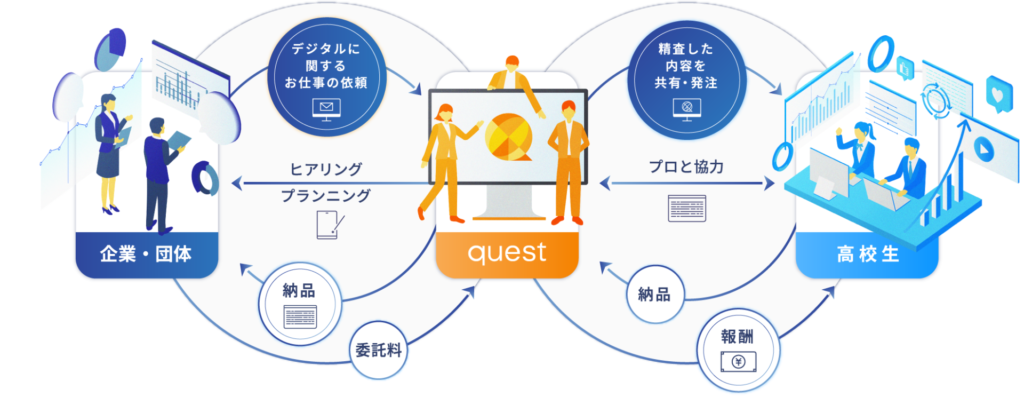 高校生には、questチームの一員として案件に携わり、納品後に作業分の報酬が手元に届くことになっています。